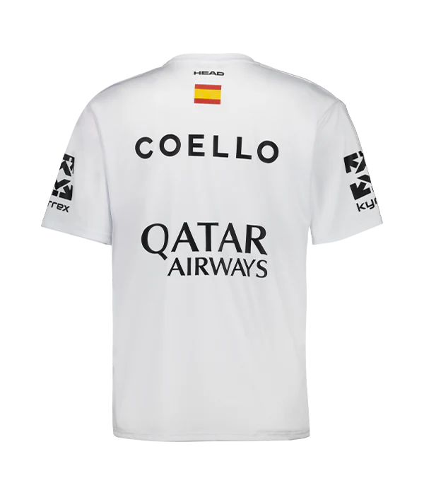 La camiseta Coello para hombre, confeccionada en poliéster 100% y con cuello redondo, ofrece un estilo deportivo y una comodidad moderna y atlética para que te parezcas a nuestra estrella del pádel Arturo Coello. La marca HEAD y los patrocinadores del jugador añaden un toque deportivo.